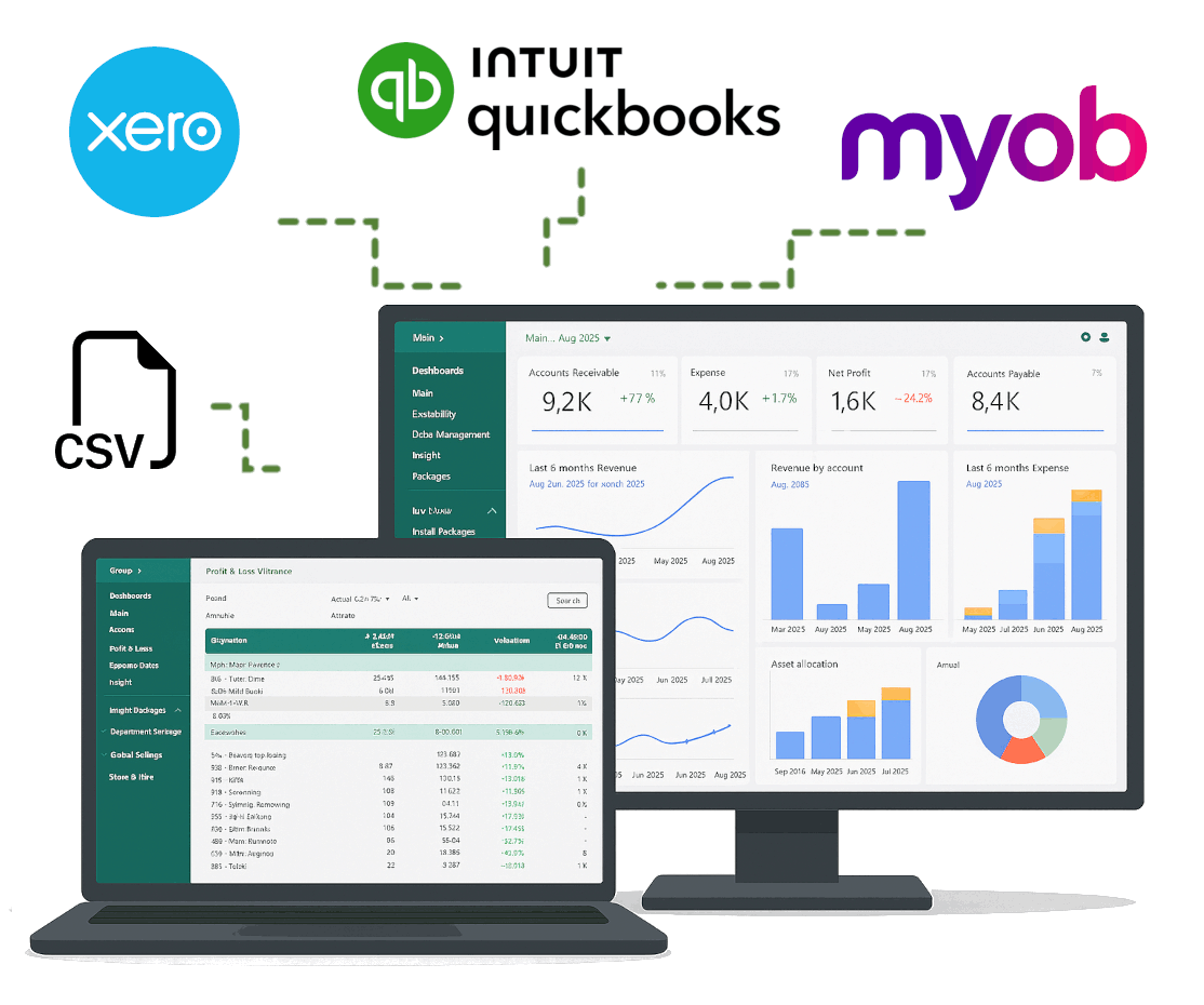Connect Xero, QuickBooks, and MYOB to unify your financial data in real time.
